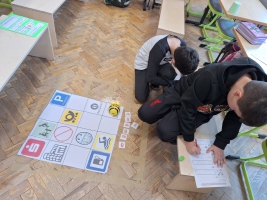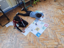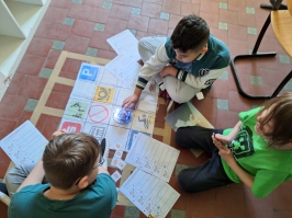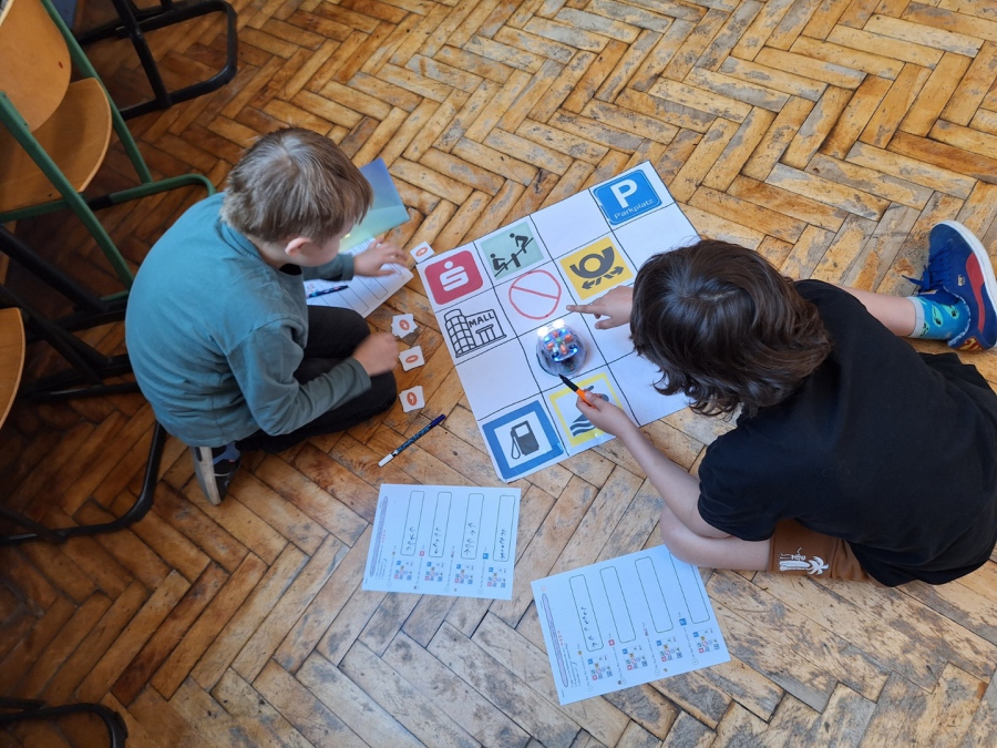 Unsere Lehramtsanwärterin Frau Tekin erstellte eigens Matten für die kleinen Roboter und erarbeitete mit den Kindern ganz genau, wie sie Wege auf diesen Matten programmieren konnten.