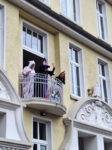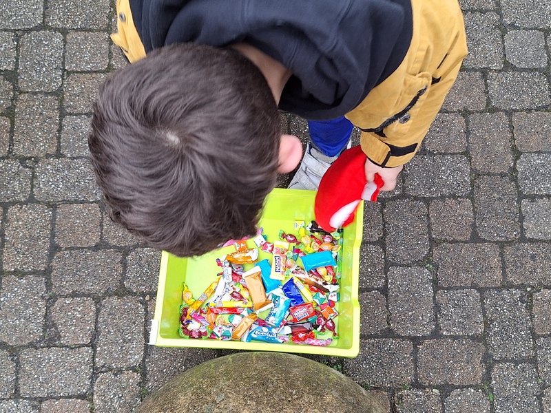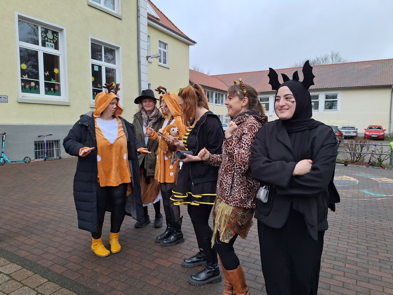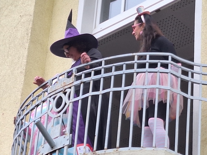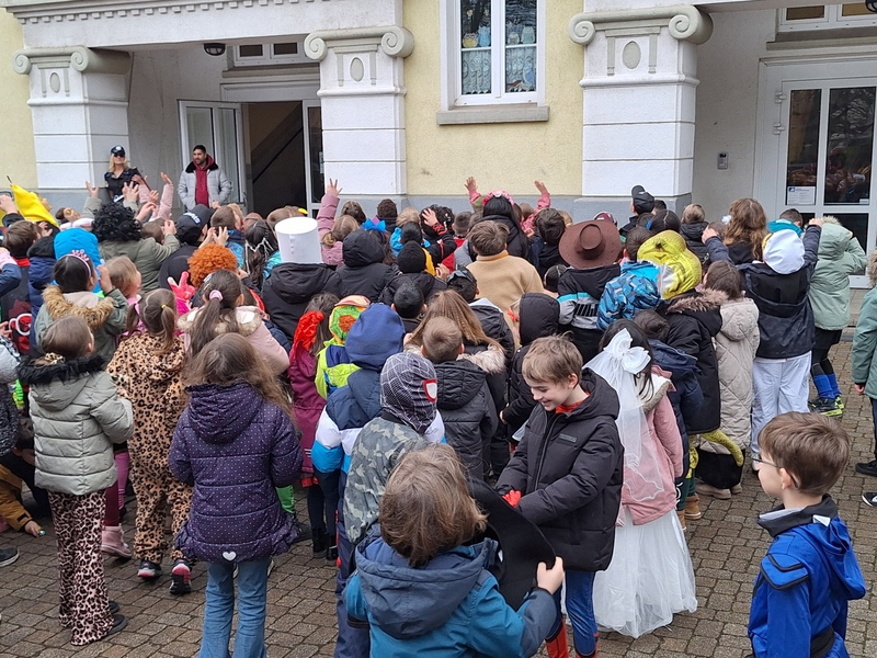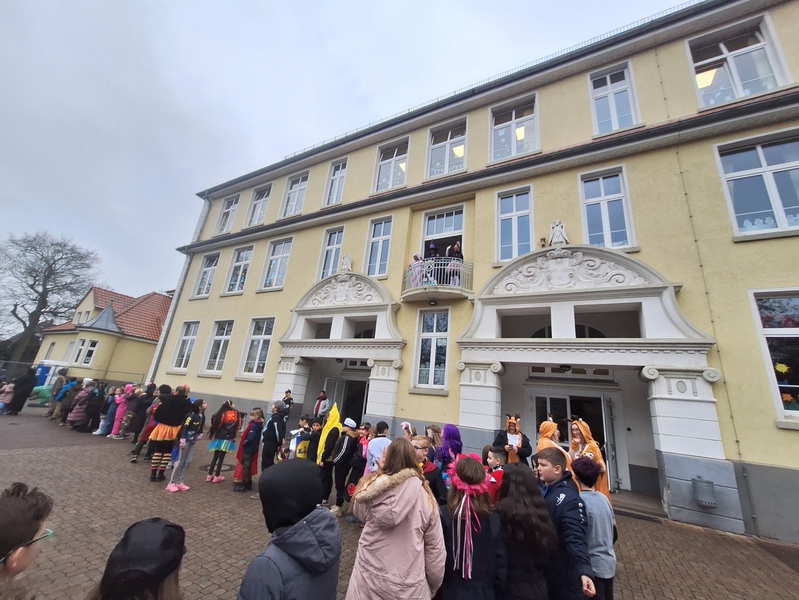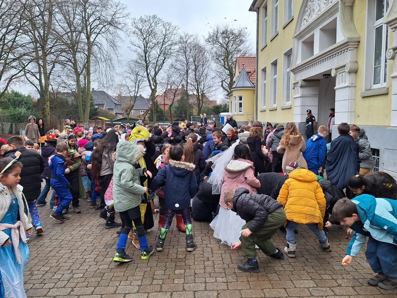 Endlich war es wieder soweit: es durfte ausgelassen gefeiert, getanzt, gelacht und gespielt werden! Karneval ist immer ein wunderschönes Erlebnis und lässt den Alltag sowie das Lernen ganz weit in den Hintergrund rücken. In der ersten Stunde beschäftigten sich die Kinder zum Thema "Karneval", aber in der zweiten Stunde konnten wir durchstarten. Mit einer Polonaise durch das gesamte Schulgebäude sammelten wir alle Kinder ein und versammelten uns auf dem Vorderschulhof. Frau Mushold betrat den kleinen Balkon und warf mit zwei fleißigen Helferlein vom Förderverein -zum Erstaunen aller- Karamelle vom Balkon. Ein erstes Gedrängel löste sich nach den ersten Funden schnell auf und alle konnten Süßes ergattern.