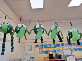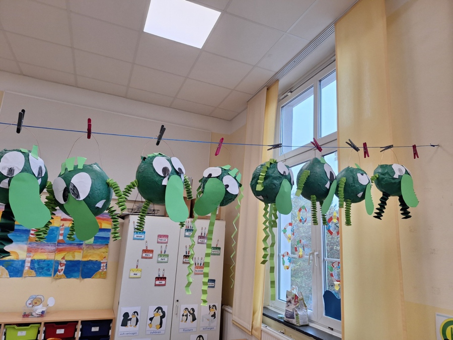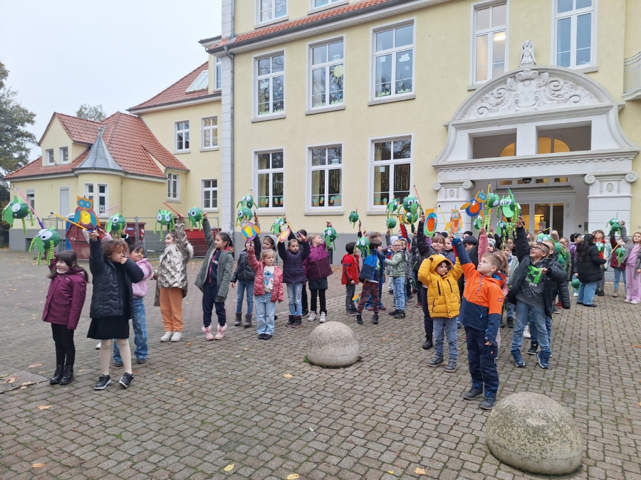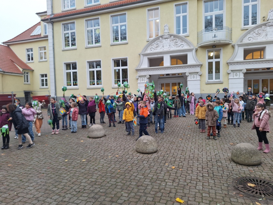 Nachdem in der vorherigen Woche in allen Klassen fleißig wunderschöne Laternen gebastelt wurden, entschieden sich einzelne Klassen spontan zu einem Laternenspaziergang - schließlich wollten die Laternen einmal ausgeführt und gezeigt werden! So liefen die Erst- und Drittklässler die schon bekannte "Sponsorenlaufrunde" (wobei einige Olchis zwischendurch fleißig Müll aus Mülleimern fressen wollten). Die frische Luft am frühen Morgen tat wirklich gut!