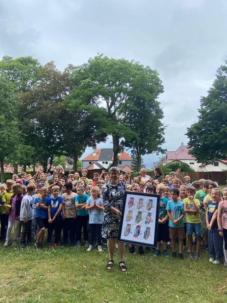 Wir versammelten uns also auf dem Schulhof und die Klassen überreichten Frau Kentner gemalte Buscheulen und Glückwünsche für die freie Zeit nach der Schule und viele Blumen. Die Klasse 2a führte einen Tanz auf und die ganze Schule tanzte den Flashmob-Tanz zu dem Lied "I'm happy" mit.