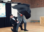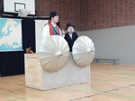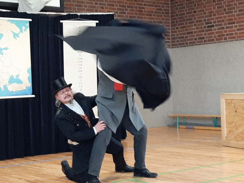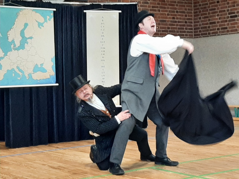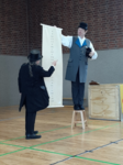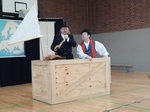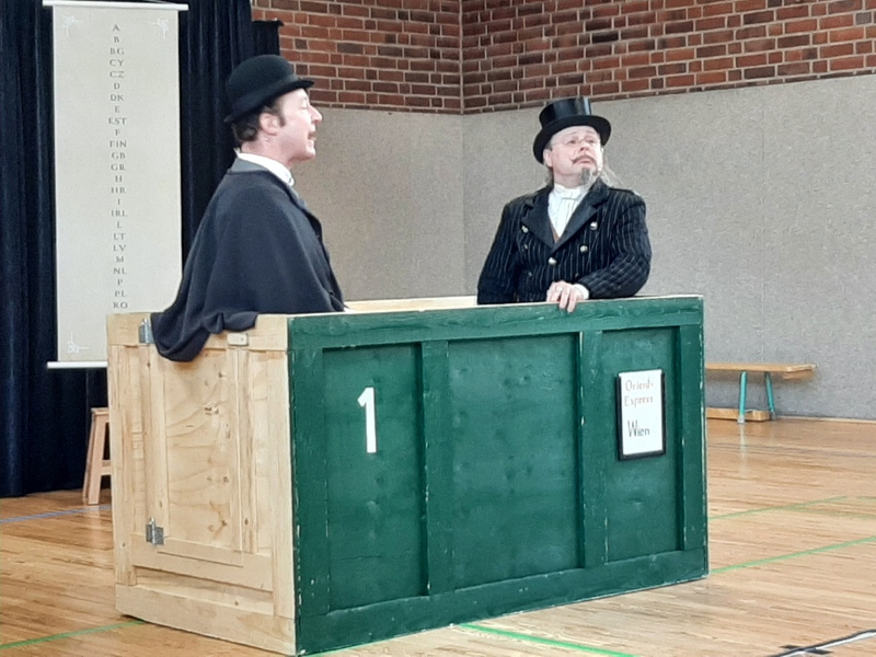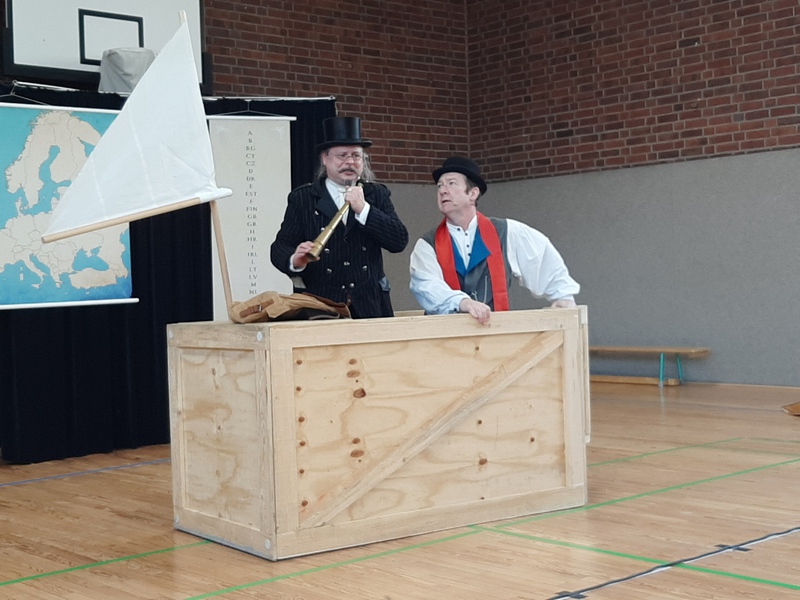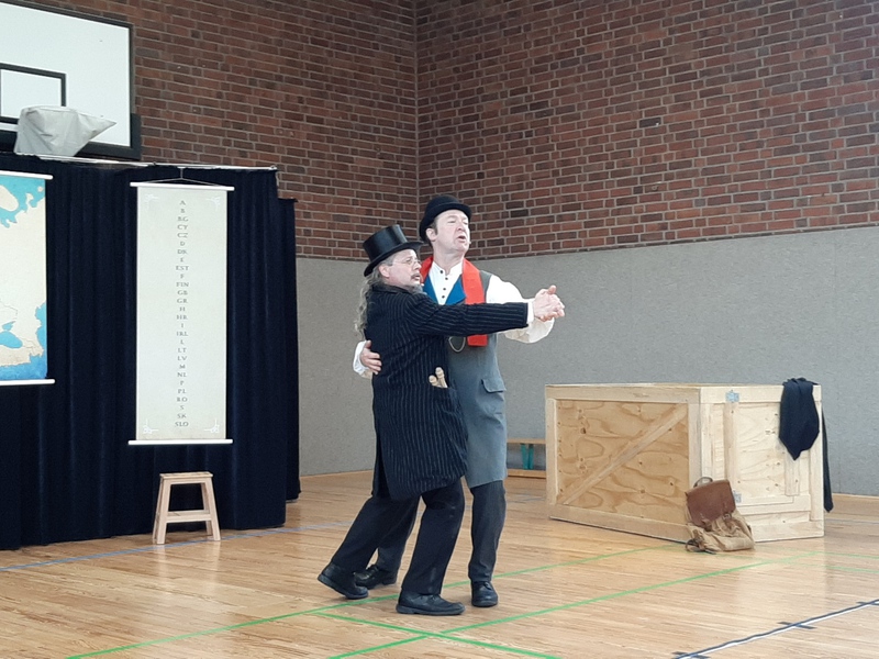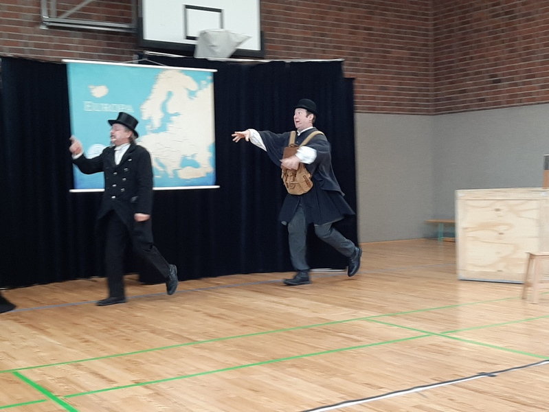 Wie gewohnt gab es zwei Aufführungen in der Turnhalle. Zur ersten Aufführung begaben sich die Zweit- und Viertklässler in die Halle, zur zweiten durften sich Erst- und Drittklässler dort versammeln. Gezeigt wurde eine Fortführung des bekannten und in verschiedenen Formen schon verfilmten Romans "In 80 Tagen um die Welt" von Jules Verne. Phileas Fogg und sein französischer Diener Jean Passepartout (gespielt von Frank Dukowski und Marcell Kaiser) lassen sich nach der Behauptung "Wer Europa nicht kennt, der kennt die Welt nicht!" im Reformklub auf eine neue Wette ein und begeben sich wieder auf eine Reise, diesmal mit den verschiedensten Verkehrsmitteln quer durch Europa. Mit viel Spaß, guter Laune und großartiger musikalischer Unterstützung durch das Pindakaas-Quartett erfuhren die Kinder viel über die verschiedenen Einigartigkeiten europäischer Länder.